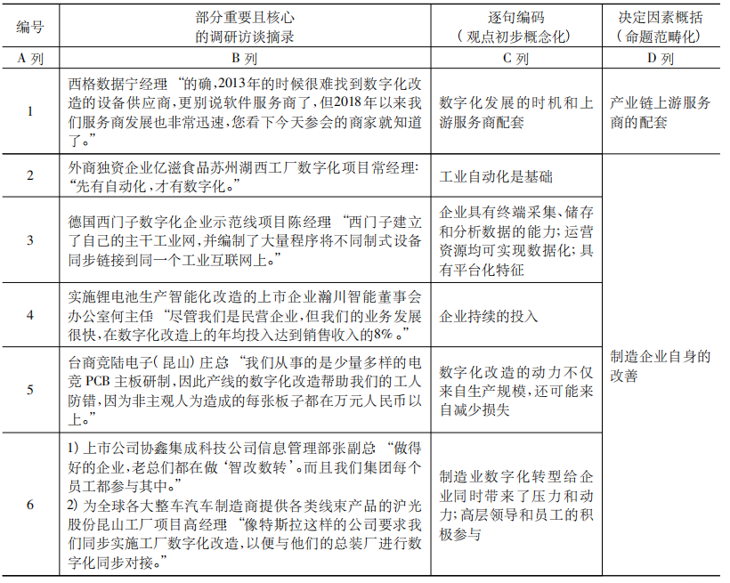 隨后,在初步概念化的基礎上,繼續按照縱向產業鏈上各參與者觀點,對數字化改造的決定因素這一命題進行范疇化,參見表6D列,整個范疇化過程的分析如下: