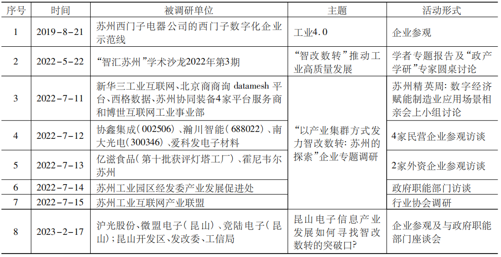 蘇州規上企業工業總產值2021年末到達41308.1億元,全國城市排名第二;根據工信聯《全國兩化融合發展水平區域比較》,江蘇省工業化和信息化融合發展水平連續七年位居全國第一,而蘇州又在“兩化融合”方面的成績全省領先;蘇州在中國獲評“燈塔工廠”數量的城市排名第一(表2)。為此我們課題組6人(其中3位教授,3位博士)歷時三年半,長期跟蹤工業4.0和制造業數字化改造實踐,并在蘇州當地開展了一系列調研活動,參見表5