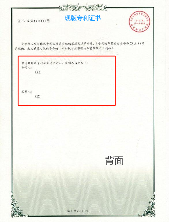 2.專利申請日時申請人、發(fā)明人信息,從證書背面來到證書正面。