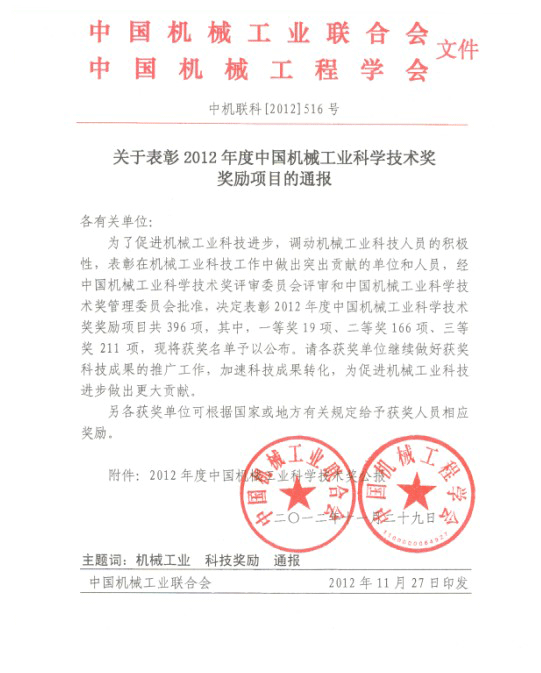2012年度中國機械工業(yè)科學(xué)技術(shù)獎公報