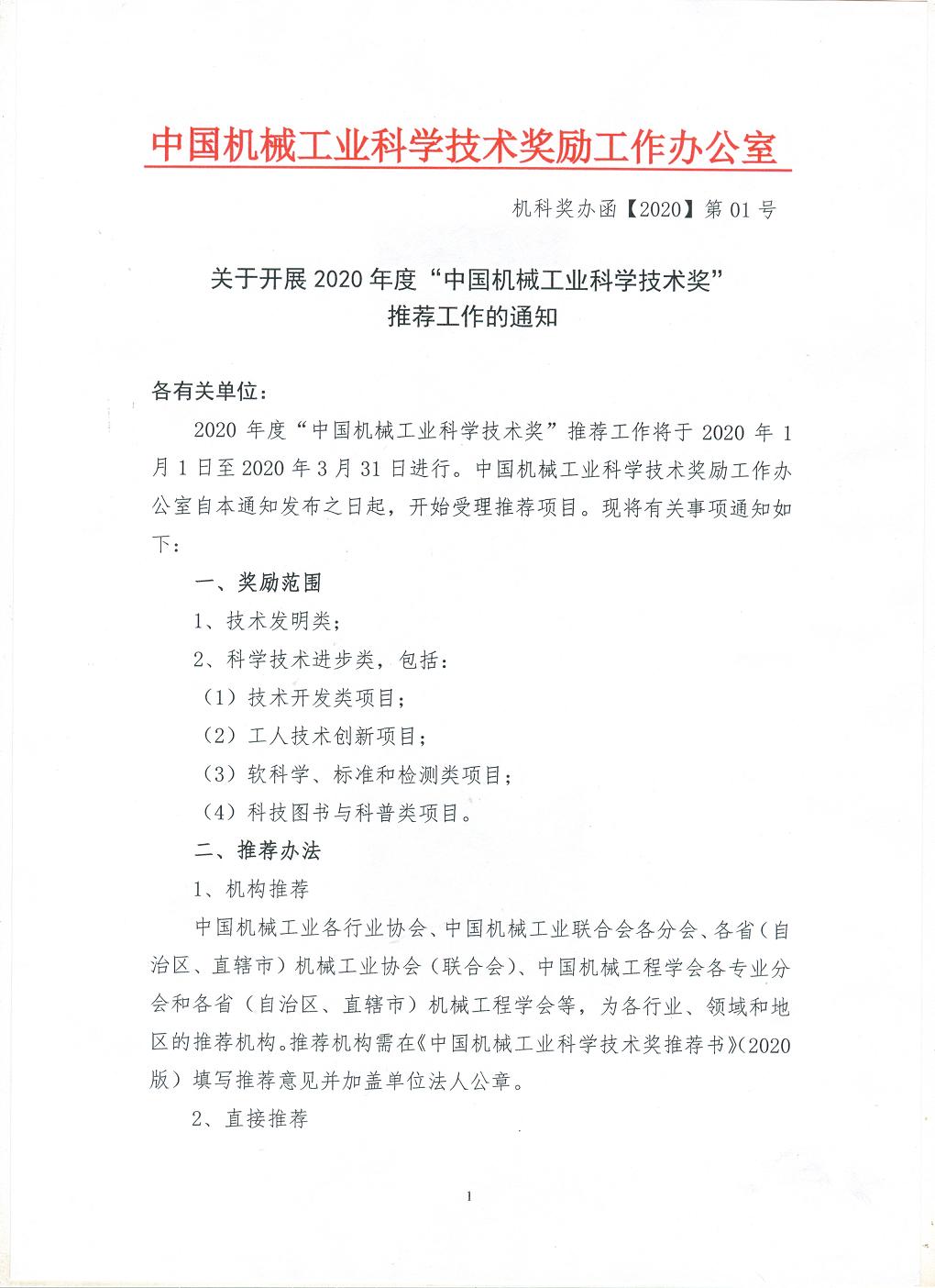 2020年度中國機械工業科學技術獎推薦工作正式開展