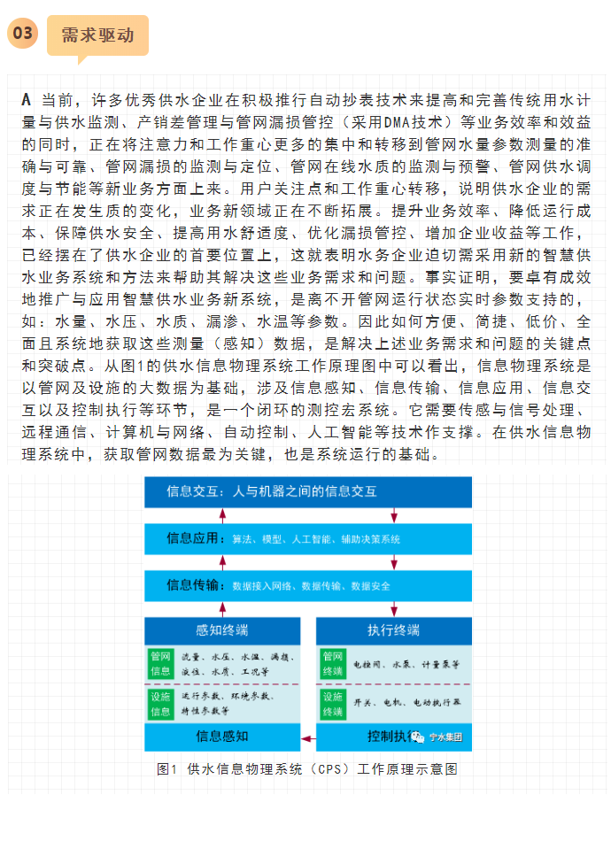 寧水集團2019年初在主板A股上市后,進一步確立了服務于智慧供水新業務的戰略方針與目標,在持續做好水表產品水計量性能提升、以NB-IoT及5G技術等為代表的無線數據遠傳業務拓展以及DMA分區計量漏損監測、水務信息化應用等工作基礎上,正在努力向供水管網數據綜合提供商和智慧供水核心業務服務商轉型與升級,其近中期目標是向供水企業提供在線一體化的高性價比管網綜合大數據感知裝置(包括:水量、水壓、水質、漏滲、水溫等參數),為智慧供水新業務及水務信息化云平臺提供海量數據支撐,使現有水力、水質、漏損、能耗等水務管網模型運行準確度能夠顯著提升。