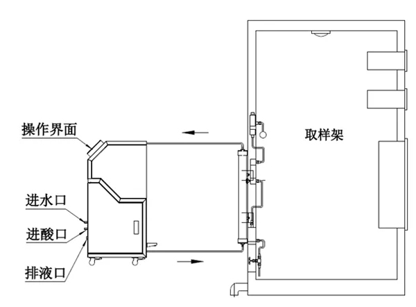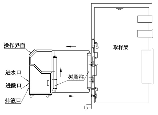 取樣架上發(fā)生樹脂失效時(shí),運(yùn)行管路直接連接到再生裝置上,再生裝置上預(yù)留兩個(gè)樹脂柱安裝位,可存放新樹脂柱,保證系統(tǒng)運(yùn)行取樣的連續(xù)不間斷;空出的失效樹脂柱與再生裝置連接,啟動(dòng)再生升系統(tǒng),等待系統(tǒng)完成再生即可更換到主用樹脂柱上繼續(xù)運(yùn)行取樣。