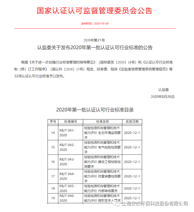 2020年9月4日,國家認(rèn)證認(rèn)可監(jiān)督管理委員會發(fā)布《2020年第21號 認(rèn)監(jiān)委關(guān)于發(fā)布2020年第一批認(rèn)證認(rèn)可行業(yè)標(biāo)準(zhǔn)的公告》,《RB/T 041-2020 檢驗檢測機(jī)構(gòu)管理和技術(shù)能力評價 生態(tài)環(huán)境監(jiān)測要求》、《RB/T 042-2020 檢驗檢測機(jī)構(gòu)管理和技術(shù)能力評價 電氣檢驗檢測要求》、《RB/T 043-2020 檢驗檢測機(jī)構(gòu)管理和技術(shù)能力評價 建設(shè)工程檢驗檢測要求》、《RB/T 044-2020 檢驗檢測機(jī)構(gòu)管理和技術(shù)能力評價 防雷裝置檢測要求》、《RB/T 045-2020 檢驗檢測機(jī)構(gòu)管理和技術(shù)能力評價 內(nèi)部審核要求》、《RB/T 046-2020 檢驗檢測機(jī)構(gòu)管理和技術(shù)能力評價 授權(quán)簽字人要求》獲得批準(zhǔn)發(fā)布。