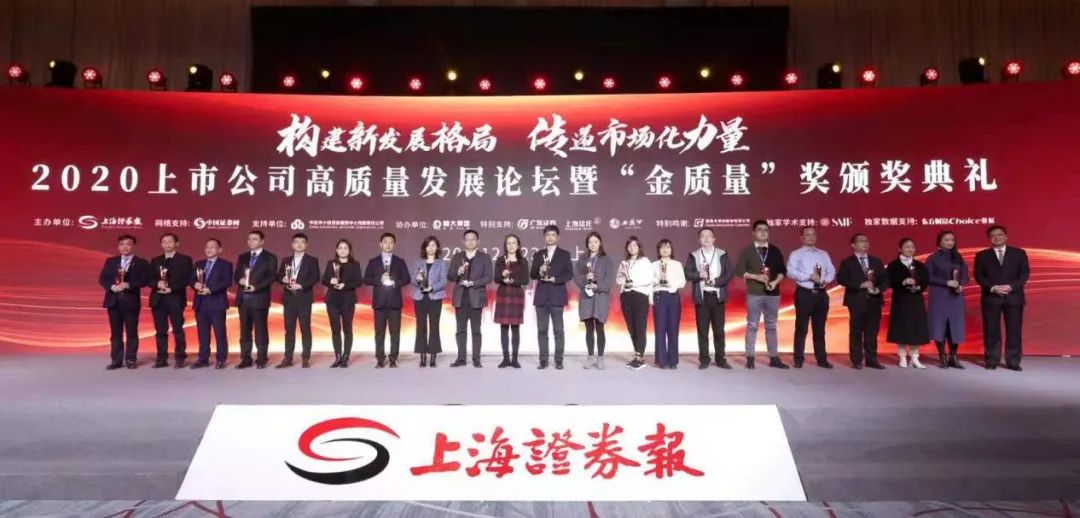 2020年12月23日,由上海證券報主辦的“2020年上市公司高質量發展論壇”暨“金質量”獎頒獎典禮在上海浦東隆重舉行。本次論壇以“構建新發展格局 傳遞市場化力量”為主題,匯聚了435家上市公司高管,這些公司合計市值近18萬億元。來自監管層多位領導及上市公司掌門人作了精彩的演講。