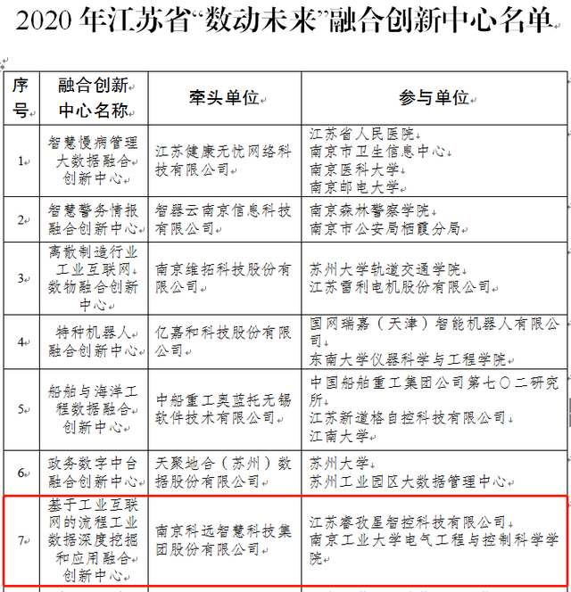 近日,江蘇省工信廳公開發(fā)布了《2020年江蘇省“數(shù)動未來”融合創(chuàng)新中心名單》(蘇工信數(shù)據(jù)〔2021〕10號),南京科遠(yuǎn)智慧科技集團(tuán)股份有限公司(下簡稱“科遠(yuǎn)智慧”)牽頭成立的“基于工業(yè)互聯(lián)網(wǎng)的流程工業(yè)數(shù)據(jù)深度挖掘和應(yīng)用融合創(chuàng)新中心”成功入選。