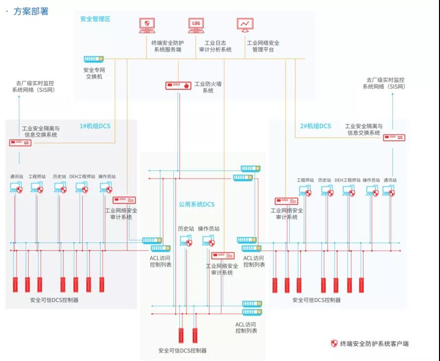 和利時典型火電控制系統網絡安全解決方案,遵照等保2.0與能源局36號文等政策法規要求,遵循“安全分區、網絡專用、橫向隔離、縱向保證”防御體系,針對火電廠監控系統進行安全防護設計。對火電廠監控系統進行合理的區域劃分,通過防護方案使火電廠生產監控系統具有抵御黑客、病毒、惡意代碼等網絡與應用系統的破壞和攻擊,阻止內部人員的非法訪問,抵御外部攻擊,在遭受攻擊和破壞后能及時恢復系統的能力,確保關鍵業務數據的可用性、機密性、完整性。