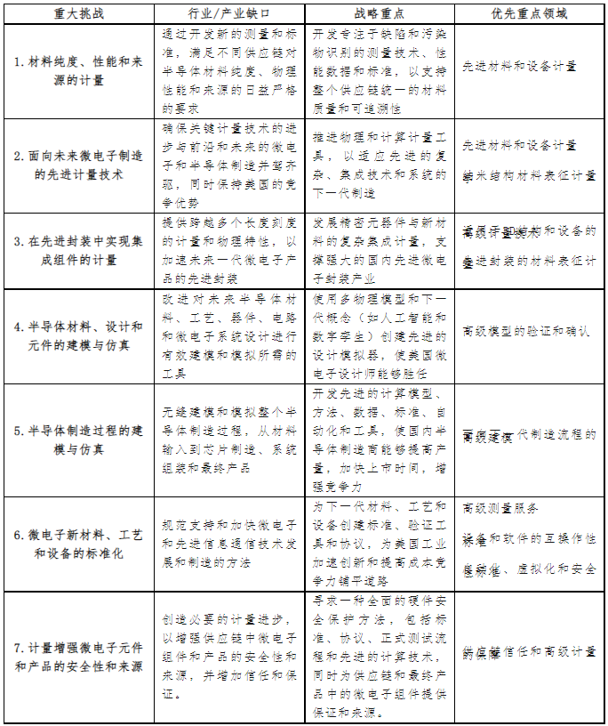 2022年9月的《美國半導(dǎo)體行業(yè)的戰(zhàn)略機(jī)遇》報(bào)告中,確定了從計(jì)量學(xué)角度需要重點(diǎn)關(guān)注的7大挑戰(zhàn),以實(shí)現(xiàn)美國領(lǐng)導(dǎo)的全球半導(dǎo)體行業(yè)的未來國家愿景。到2022年11月,芯片研發(fā)計(jì)量計(jì)劃將其投資組合進(jìn)一步細(xì)化為10個(gè)優(yōu)先重點(diǎn)領(lǐng)域,以解決最關(guān)鍵的計(jì)量研發(fā)缺口。七大挑戰(zhàn)及對(duì)應(yīng)優(yōu)先重點(diǎn)領(lǐng)域如下: