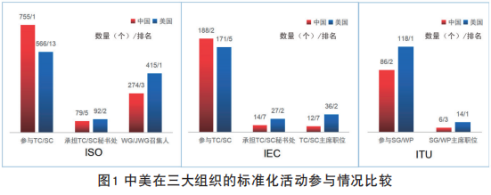 隨著標準國際化的深入,中國和美國積極尋求在三大國際標準化組織(ISOIECITU)中的參與度和影響力。本文根據三大國際組織官方網站及其最新的年度報告,以及美國大西洋理理事會研究報告《標準化未來:美國如何駕馭國際技術標準的地緣政治?》中的數據,比較了中美在三大組織的國際標準化活動情況(見圖1)。