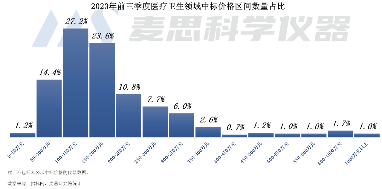 從各價格區間的中標數量占比來看,醫療衛生領域質譜儀器中標單價基本在50-350萬元之間,占比約90%。其中,單價在100-150萬元以內的質譜儀器數量最多,2023年前三季度中標數量占比約27.2%