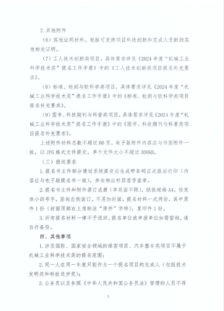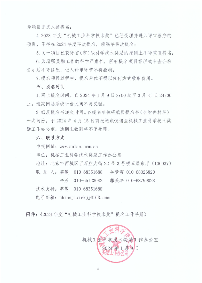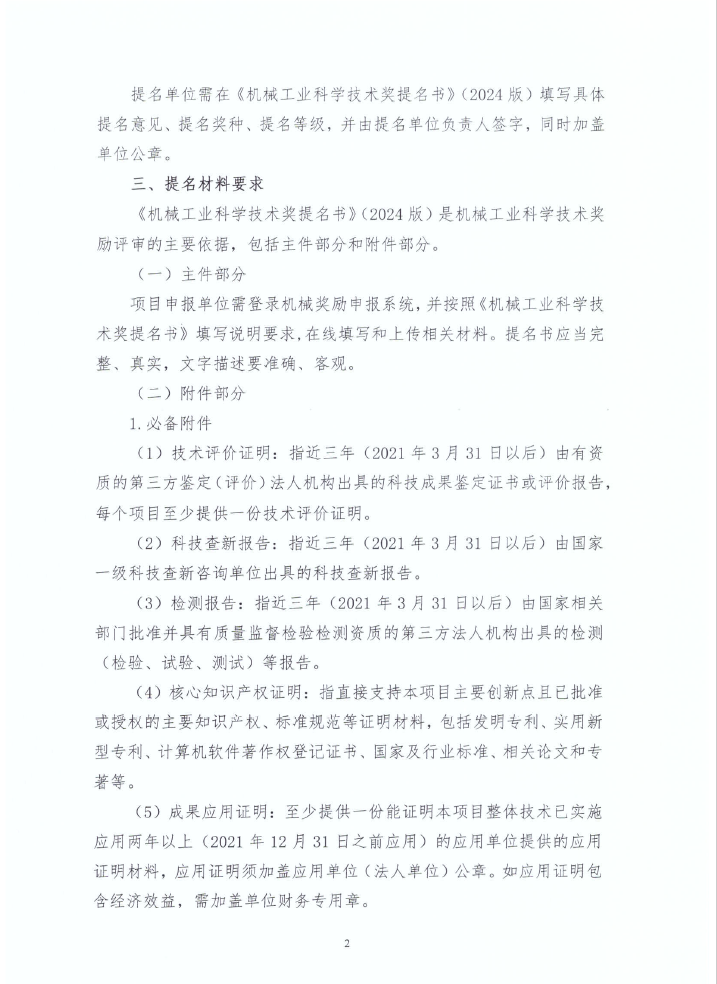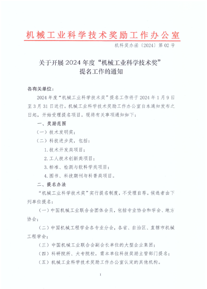 2024年度“中國機械工業(yè)科學技術獎”提名工作將于2024年1月9日至3月31日進行。中國機械工業(yè)科學技術獎勵工作辦公室自本通知發(fā)布之日起,開始受理提名項目。(詳見通知)