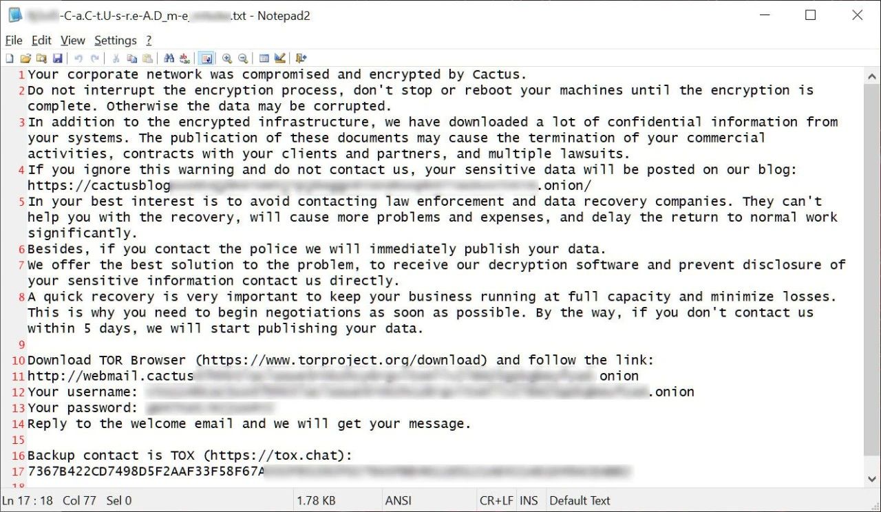 Cactus 勒索軟件行動于 2023 年 3 月啟動,與所有勒索軟件行動一樣,威脅攻擊者會通過購買憑證、與惡意軟件分銷商合作、網絡釣魚攻擊或利用漏洞入侵企業網絡。一旦進入網絡,就會悄悄擴散到其他系統,同時竊取服務器上的企業數據。在竊取數據并獲得網絡管理權限后,威脅攻擊者會加密文件并留下贖金說明。