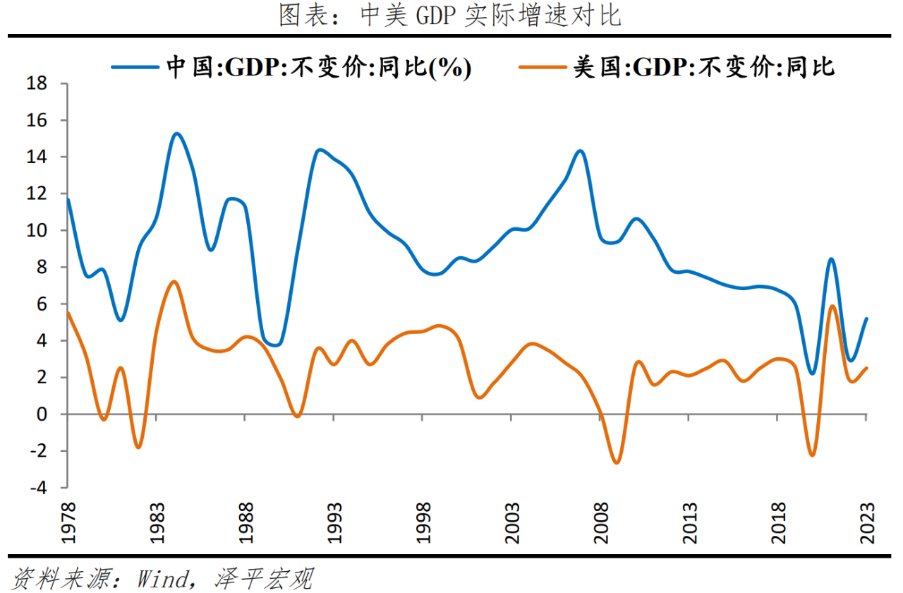 2023年中國GDP規(guī)模達126萬億元,相當(dāng)于17.9萬億美元,保持世界第二大經(jīng)濟體地位。美國2023年GDP為27.4萬億美元,中國GDP相當(dāng)于美國的約65.4%,受匯率影響,中美差距略有擴大。2023年中國GDP實際增速5.2%,低于1978-2008年高速增長期的平均增速9.8%,高于美國的2.5%,越南、印度經(jīng)濟增速分別為5.1%和6.7%。