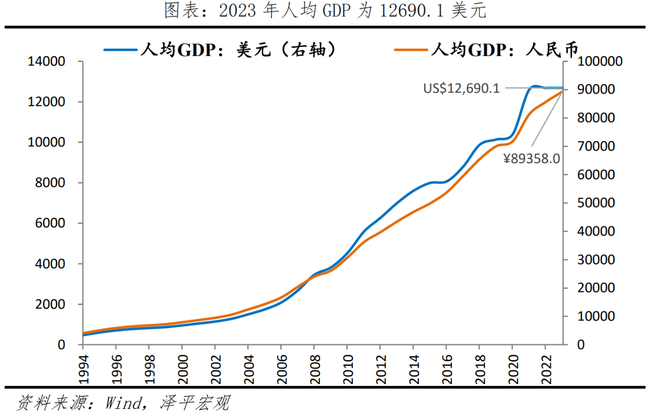我國已接近高收入國家標(biāo)準(zhǔn),但距離2萬美元的發(fā)達國家門檻仍有一段距離。2023年人均GDP為89358.0元,名義增長5.4%,較上年增速擴大2.4個百分點;全員勞動生產(chǎn)率為161615元/人,比上年提高5.7%。按世界銀行標(biāo)準(zhǔn),高收入國家人均GNI門檻約為13845美元。以美元計價,我國2023年人均GDP為12690.1美元,人均GNI為12596.6美元,接近高收入國家門檻。