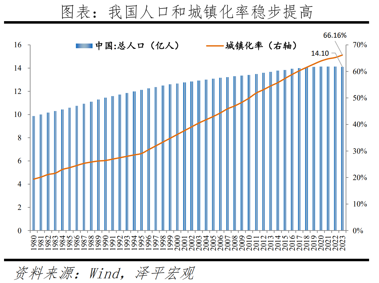 2023年末常住人口城鎮(zhèn)化率達66.16%,較上年末提高0.94個百分點,標(biāo)志著當(dāng)前我國新型城鎮(zhèn)化進程穩(wěn)步推進,但較高收入經(jīng)濟體的81.3%仍有15.1個百分點的空間。過去四十年,中國城鎮(zhèn)常住人口從1.7億快速增至9.3億,凈增加7.6億,城鎮(zhèn)化率從17.9%提升至66.2%,提高48.3個百分點,深刻地改變了中國經(jīng)濟社會格局,成就了過去中國重化工業(yè)、大規(guī)模基礎(chǔ)設(shè)施投資、房地產(chǎn)、消費升級等的飛速發(fā)展。當(dāng)前中國城鎮(zhèn)化率已高于55.3%的世界平均水平,達到中高收入經(jīng)濟體水平,但明顯低于高收入經(jīng)濟體的81.3%,中國城鎮(zhèn)化還有約15.1個百分點的空間。