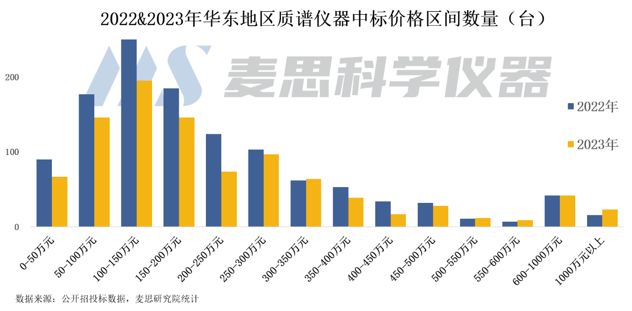 從各價格區間的中標數量來看,華東地區質譜儀器中標單價主要集中在350萬元以內,占比超80%。其中,中標單價在100-150萬元以內的質譜儀器數量最多,2023年中標數量占比為20%;其次為50-100萬元以及150-200萬元的質譜儀,占比均為15%