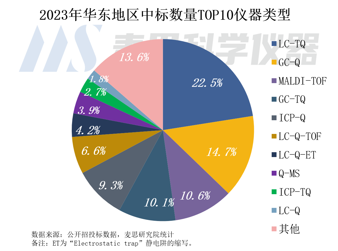 2023年華東地區中標數量Top10儀器類型分別為LC-TQGC-QMALDI-TOFGC-TQICP-QLC-Q-TOFLC-Q-ETQ-MSICP-TQLC-Q,合計中標數量占比86.4%