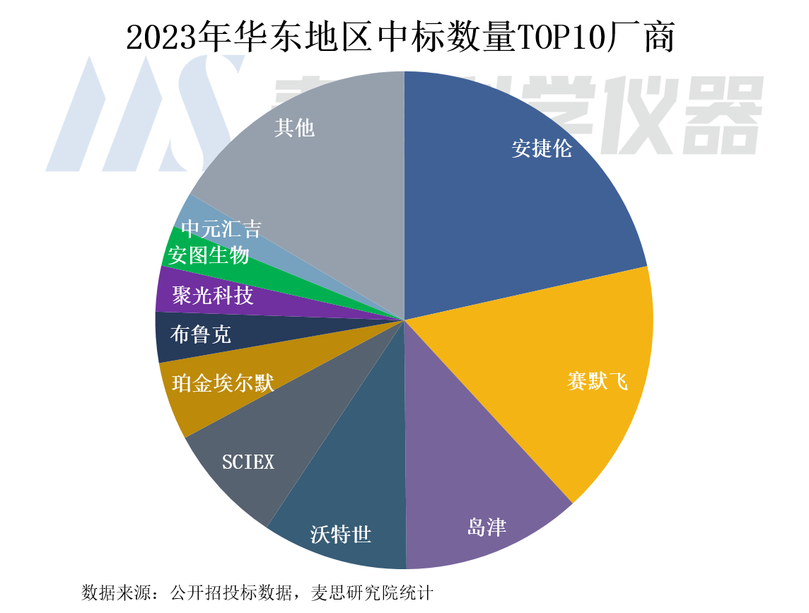 華東地區質譜儀器中標數量Top 5企業分別為安捷倫、賽默飛、島津、沃特世和SCIEXTop 5占比超65%。國內廠商中,聚光科技、安圖生物和中元匯吉三家企業進入Top 10行列。