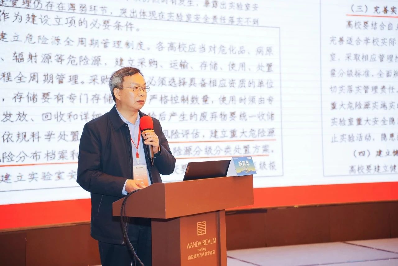 北京理工大學實驗室與設備管理處原處長、中國高等教育學會實驗室管理工作分會監事長、實驗室建設與安全分會副理事長史天貴,浙江省教育廳校園安全處原處長、一級調研員胡惠華,東南大學實驗室與設備管理處處長、教育部高等學校實驗室建設與實驗教學指導委員會秘書長、中國高等教育學會實驗室管理工作分會副秘書長熊宏齊,西安交通大學實驗室管理處處長、中國高等教育學會實驗室管理工作分會副理事長朱臻,華中科技大學實驗室與設備管理處原處長、中國高等教育學會實驗室分會常務理事、湖北省高校實驗室工作研究會副理事長兼秘書長、本分會副理事長李震彪,中國礦業大學實驗室與設備管理處處長、中國高等教育學會實驗室管理工作分會常務理事、技術安全部副部長、煤炭高等教育實驗室工作研究會秘書長、本分會副理事長吳祝武,無錫賽弗安全裝備有限公司董事長、實驗室建設與安全分會副理事長兼秘書長王龍生,揚州天輝實驗室裝備環保工程有限公司董事長、本分會副理事長李躍出席會議并在主席臺就坐。