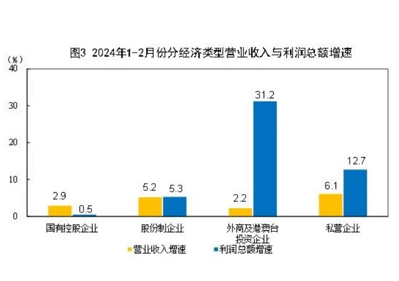 12月份,規模以上工業企業中,國有控股企業實現利潤總額3434.9億元,同比增長0.5%;股份制企業實現利潤總額6898.5億元,增長5.3%;外商及港澳臺投資企業實現利潤總額2169.2億元,增長31.2%;私營企業實現利潤總額2465.4億元,增長12.7%