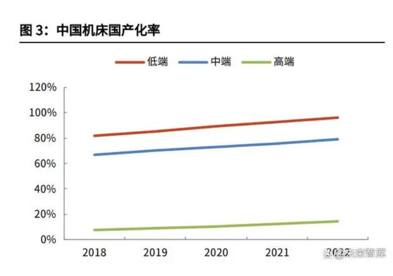 目前我國低端數(shù)控機(jī)床基本達(dá)到自給自足,中端數(shù)控機(jī)床基本實現(xiàn)國產(chǎn)替代,但 高端數(shù)控機(jī)床國產(chǎn)化率仍處于較低水平。根據(jù)科德數(shù)控公告,截至 2022 年底國內(nèi)高端機(jī)床國產(chǎn)化率不足 10%。據(jù)中國機(jī)床工具工業(yè)協(xié)會數(shù)據(jù),2023 年金屬切削機(jī)床數(shù)控化率為 45.5%。在發(fā)達(dá)國家中,日本機(jī)床數(shù)控化率維持在 80%以上,美國和德國機(jī)床數(shù)控化率均超 過 70%,與之相比國內(nèi)機(jī)床數(shù)控化率提升空間較大。