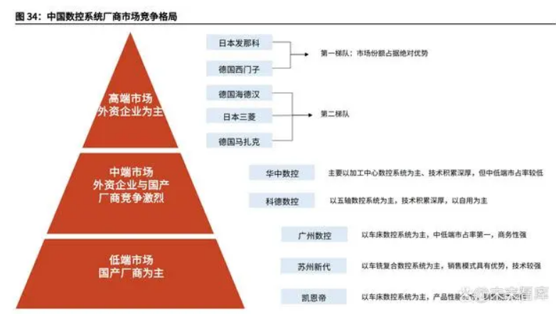 自 2017 年中國科技專項后,數(shù)控系統(tǒng)國產(chǎn)化率實現(xiàn)提升,打破高端市場外資壟 斷局面,但目前中高端市場仍以外資為主,這主要是由于數(shù)控系統(tǒng)的技術(shù)壁壘與 較高的用戶粘性。目前中國數(shù)控系統(tǒng)市場中:高端市場以外資企業(yè)為主,其中第一梯隊代表為日本發(fā)那科、德國西門子,第二 梯隊代表為德國海德漢、日本三菱、德國馬扎克;中端市場面臨外資企業(yè)與國產(chǎn)廠商的激烈競爭,其中國產(chǎn)品牌華中數(shù)控主要以加 工中心數(shù)控系統(tǒng)為主、技術(shù)積累深厚,科德數(shù)控以五軸數(shù)控系統(tǒng)為主,技術(shù)積累 深厚,以自用為主;低端市場以國產(chǎn)廠商為主,如廣州數(shù)控(以車床數(shù)控系統(tǒng)為主,中低端市占率第一,商務(wù)性強(qiáng))、蘇州新代(以車銑復(fù)合數(shù)控系統(tǒng)為主,銷售模式具有優(yōu)勢,技 術(shù)較強(qiáng))、凱恩帝(以車床數(shù)控系統(tǒng)為主,產(chǎn)品性能較好,銷售能力較弱)。