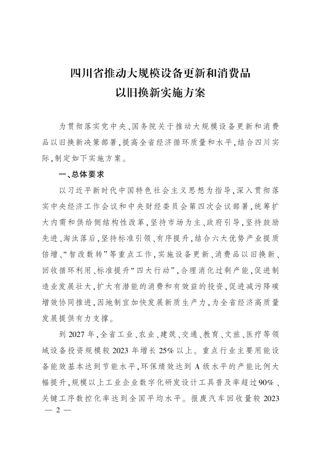 四川省人民政府關于印發《四川省推動大規模設備更新和消費品以舊換新實施方案》的通知