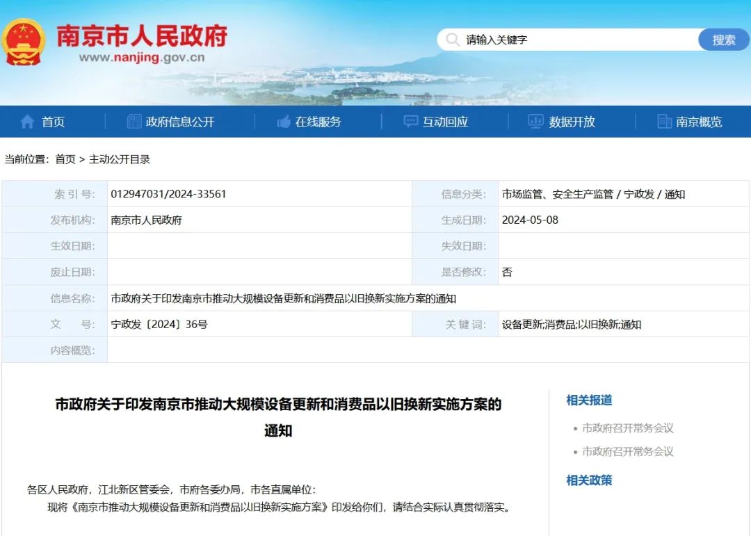 510日,從南京市人民政府官網獲悉,《南京市推動大規模設備更新和消費品以舊換新實施方案》已正式印發。