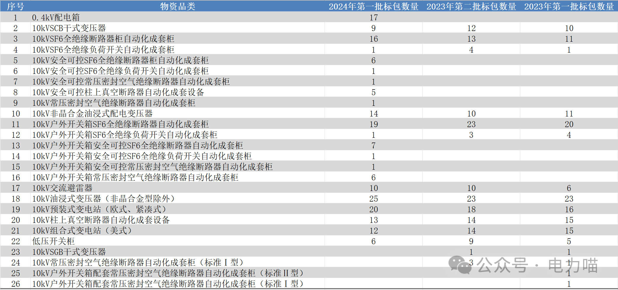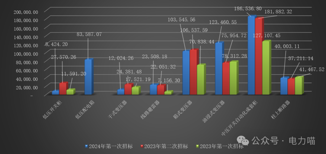 根據物資目錄分類規則,配電設備招標的三級物資名稱包括低壓開關柜、低壓配電箱、干式變壓器、線路避雷器、箱式變壓器、油浸式變壓器、中壓開關自動化成套柜、柱上斷路器共八種。