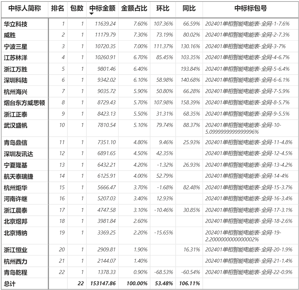 總金額15.31億元,22家企業(yè)實現(xiàn)中標,華立中標最大包1.16億元;