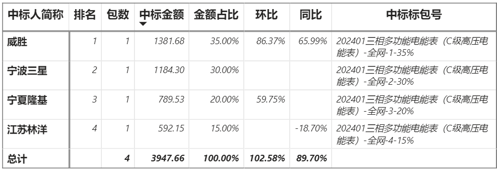 總金額3947.66萬元,4家企業(yè)實現(xiàn)中標,威勝中標最大包1381.68萬元;