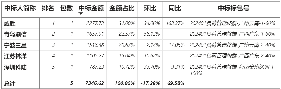總金額7346.62萬元,5家企業(yè)實現(xiàn)中標,威勝中標最大包2277.73萬元;