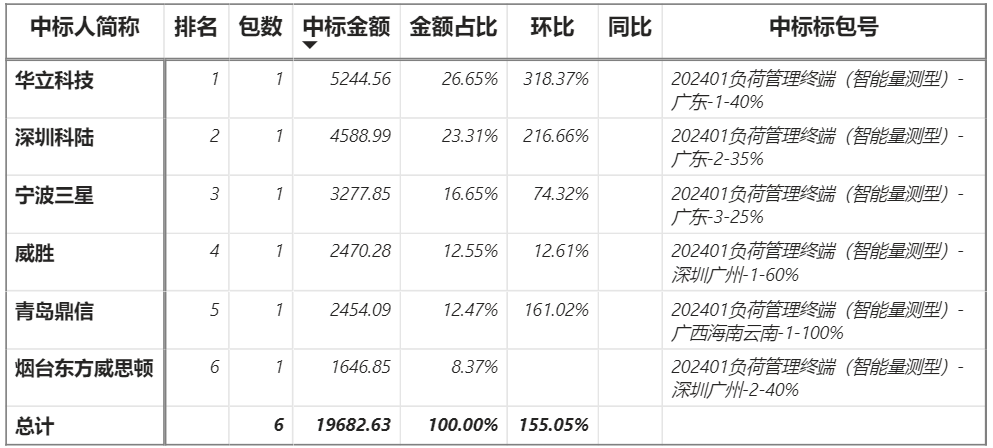 總金額1.97億元,6家企業(yè)實現(xiàn)中標,華立中標最大包5244.56萬元;