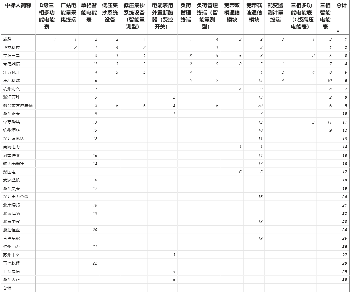 總金額43.68億元,30家企業(yè)實現(xiàn)中標(威勝集團+威勝信息計為1家,正泰電器+正泰儀表計為1家),威勝以4.32億元位列各企業(yè)第一名,華立中標3.97億元第二,三星3.80億元第三,鼎信3.53億元第四。