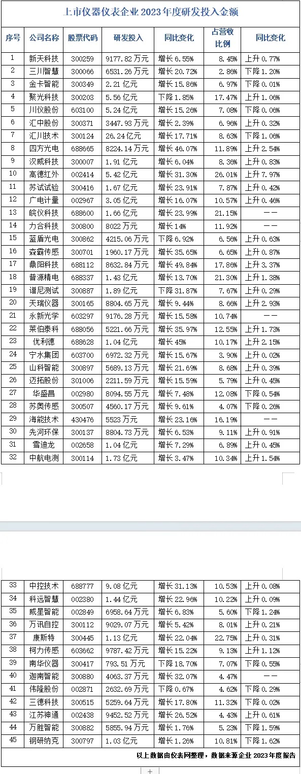 在此背景下,國內(nèi)儀器儀表企業(yè)對(duì)研究與開發(fā)方面的投入愈發(fā)重視,不斷引入創(chuàng)新,提高自身技術(shù)先進(jìn)性以生產(chǎn)出具有競(jìng)爭(zhēng)力的高質(zhì)量產(chǎn)品,從而在這場(chǎng)發(fā)展機(jī)遇中占據(jù)有利地位。為方便業(yè)內(nèi)人士深入了解我國儀器儀表企業(yè)研發(fā)投入現(xiàn)狀,儀表網(wǎng)整理了國內(nèi)45家上市儀器儀表企業(yè)2023年度研發(fā)金額、研發(fā)投入占比等數(shù)據(jù),以饗讀者。