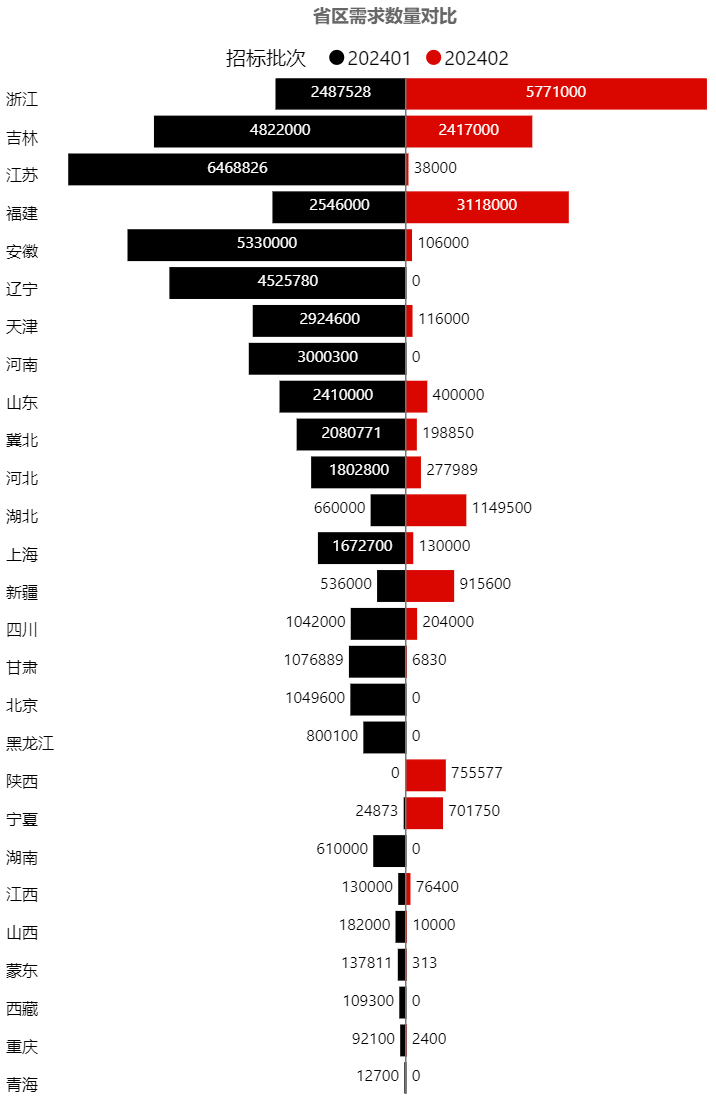 本批次的主要需求來自浙江、福建、吉林,均達(dá)到200萬只以上,以上3省需求占批次總量69%左右。