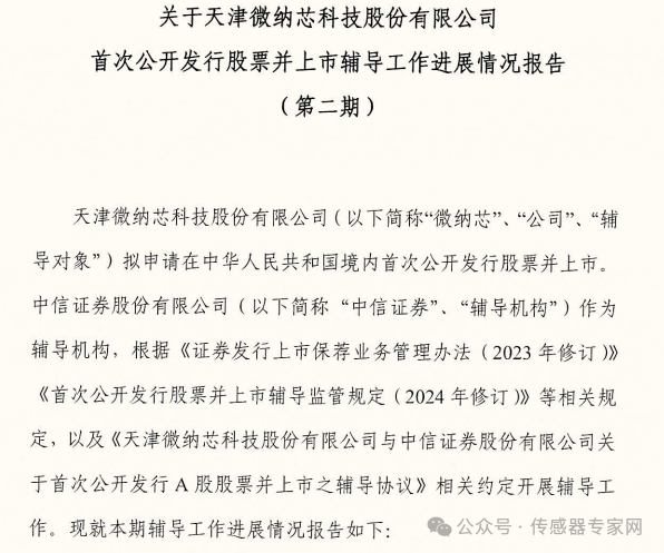 2024年1月19日,中信證券與微納芯簽署了輔導(dǎo)協(xié)議并于同日正式向中國證券監(jiān)督管理委員會天津監(jiān)管局(簡稱“天津證監(jiān)局”)報送輔導(dǎo)備案申請材料;2024年1月22日,天津證監(jiān)局同意微納芯輔導(dǎo)備案并出具輔導(dǎo)備案登記確認書。2024年4月12日,中信證券向天津證監(jiān)局報送關(guān)于天津微納芯科技股份有限公司首次公開發(fā)行股票并上市輔導(dǎo)工作進展情況報告(第一期)。2024年7月10日,中信證券向天津證監(jiān)局報送關(guān)于天津微納芯科技股份有限公司首次公開發(fā)行股票并上市輔導(dǎo)工作進展情況報告(第二期)。截至目前,中信證券對微納芯的上市輔導(dǎo)工作仍在進行中。