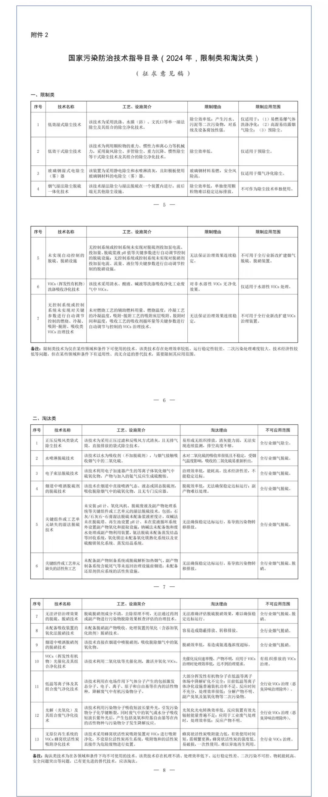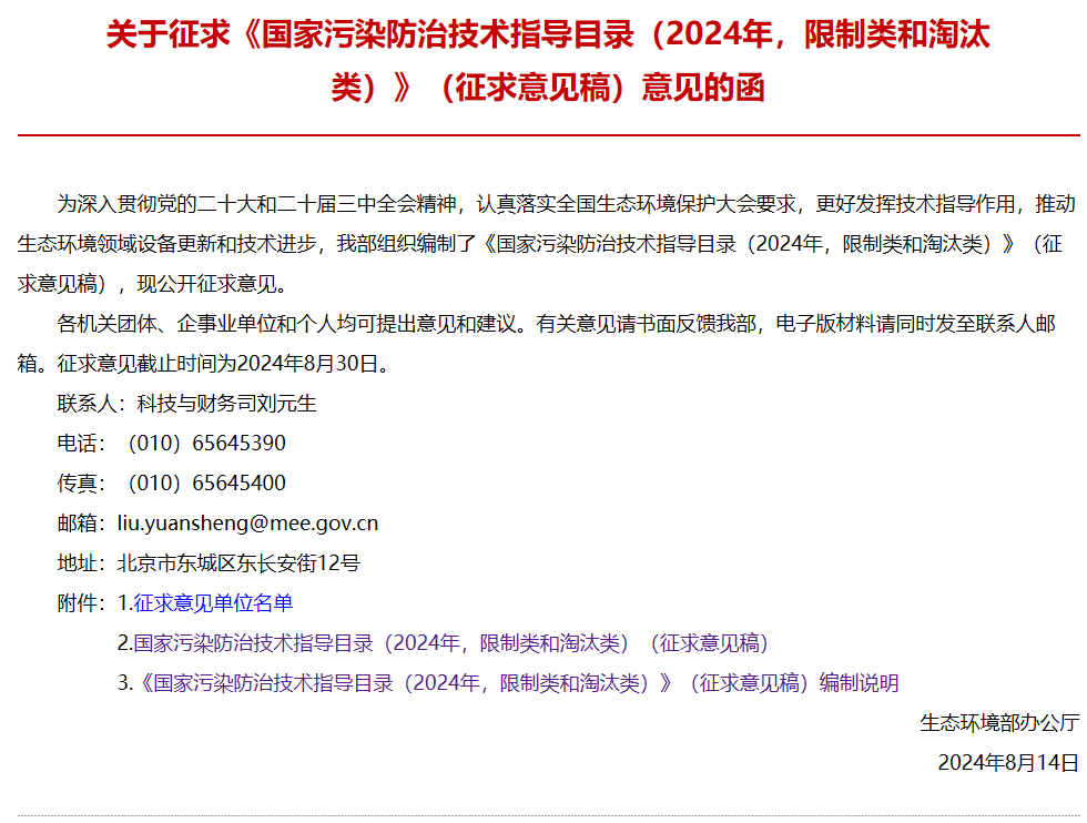 為更好發(fā)揮技術指導作用,推動生態(tài)環(huán)境領域設備更新和技術進步,生態(tài)環(huán)境部日前發(fā)布關于征求《國家污染防治技術指導目錄(2024年,限制類和淘汰類)》(征求意見稿)意見的函,向有關單位征求意見。