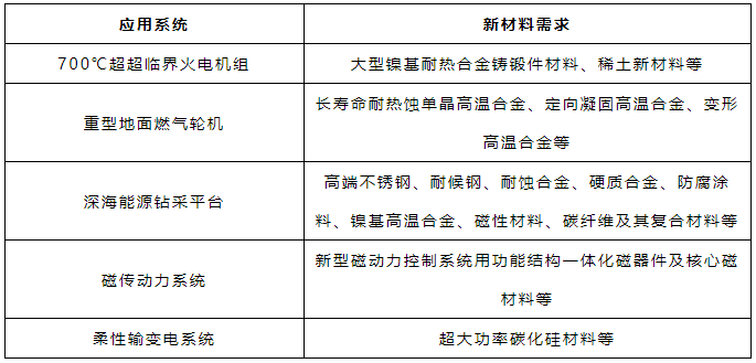 以煤炭為主和油氣資源緊缺的能源結構,決定了我國國家能源戰略發展重點在于發展新一代高效清潔燃煤發電技術和深海油氣資源開發技術。先進能源動力系統用特種合金代表國家高端裝備核心競爭力,屬于國家戰略型新材料范疇,是我國搶占技術制高點的重大機遇。核電、油氣開發等能源領域重大項目對特種合金、稀土材料、非晶材料、超導材料、復合材料等新材料提出急迫需求(見表2)。