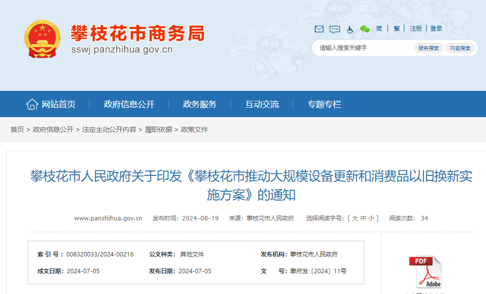 關(guān)于印發(fā)《攀枝花市推動大規(guī)模設(shè)備更新和消費品以舊換新實施方案》的通知