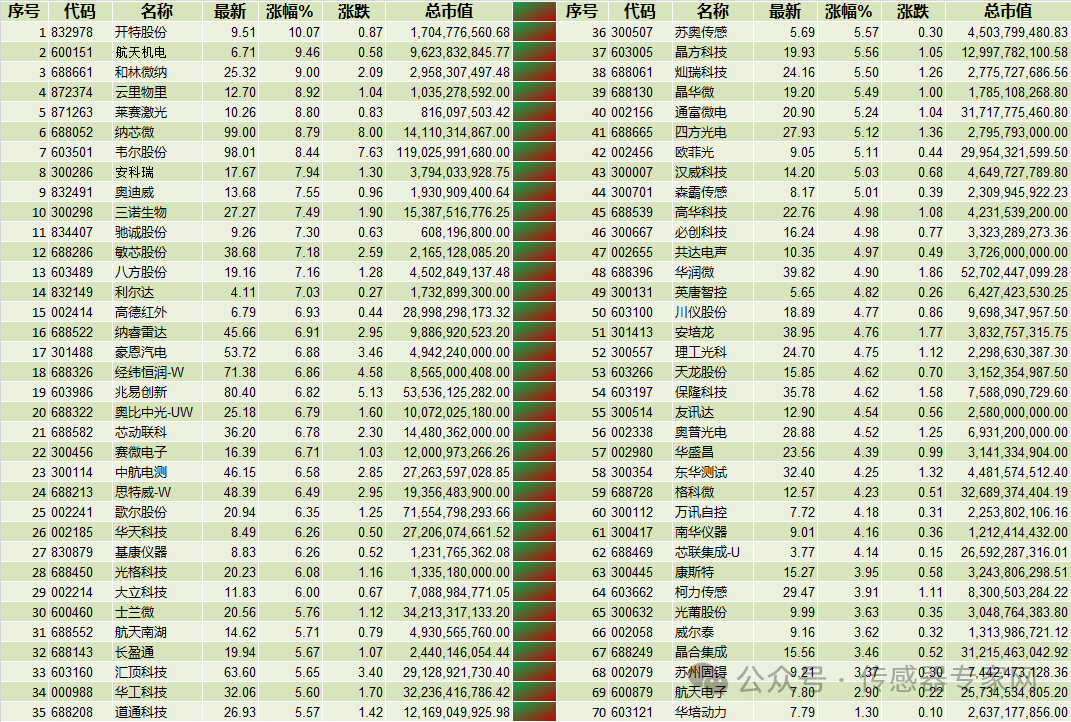 具體到中國(guó)傳感器產(chǎn)業(yè)鏈,70只傳感器核心產(chǎn)業(yè)鏈企業(yè)中,全部上漲,無(wú)一家傳感器上市股票下跌——歷史罕見(jiàn)。70只傳感器股票平均漲幅5.77%,總市值達(dá)到9453.23億元,而漲幅TOP 10傳感器股票的平均漲幅達(dá)到8.65%。