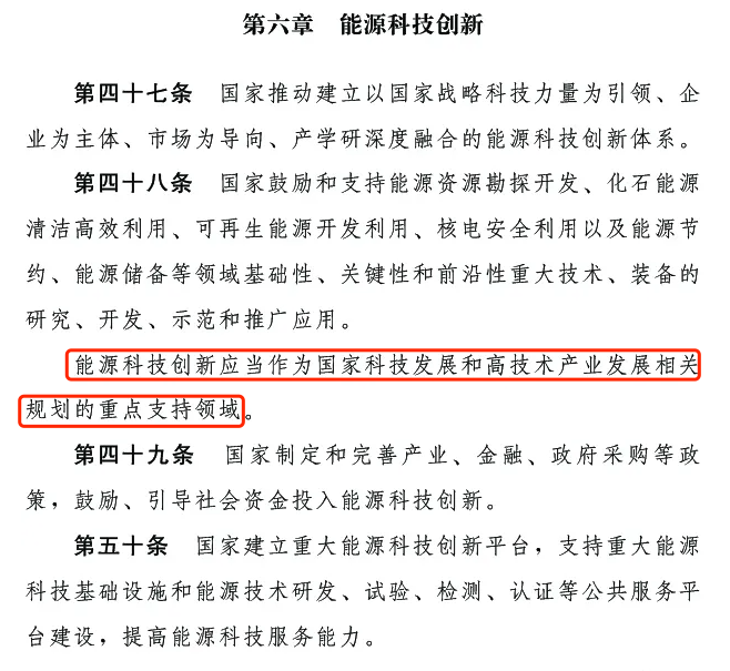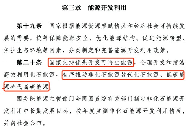 第二十條:國(guó)家支持優(yōu)先開(kāi)發(fā)可再生能源,合理開(kāi)發(fā)和清潔高效利用化石能源,有序推動(dòng)非化石能源替代化石能源、低碳能源替代高碳能源。國(guó)務(wù)院能源主管部門會(huì)同國(guó)務(wù)院有關(guān)部門制定非化石能源開(kāi)發(fā)利用中長(zhǎng)期發(fā)展目標(biāo),按年度檢測(cè)非化石能源開(kāi)發(fā)利用情況,并向社會(huì)公布。