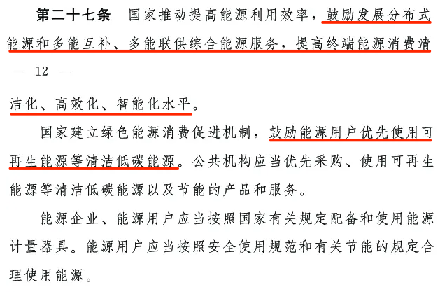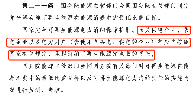 第二十一條:國(guó)家完善可再生能源電力消納保障機(jī)制。相關(guān)供電企業(yè)、售電企業(yè)以及電力用戶 (含使用自備電廠供電的企業(yè))等應(yīng)當(dāng)按照國(guó)家有關(guān)規(guī)定,承擔(dān)消納可再生能源發(fā)電量的責(zé)任。國(guó)務(wù)院能源主管部門會(huì)同國(guó)務(wù)院有關(guān)部門對(duì)可再生能源在能源消費(fèi)中的最低比重目標(biāo)以及可再生能源電力消納責(zé)任的實(shí)施情況進(jìn)行監(jiān)測(cè)、考核。