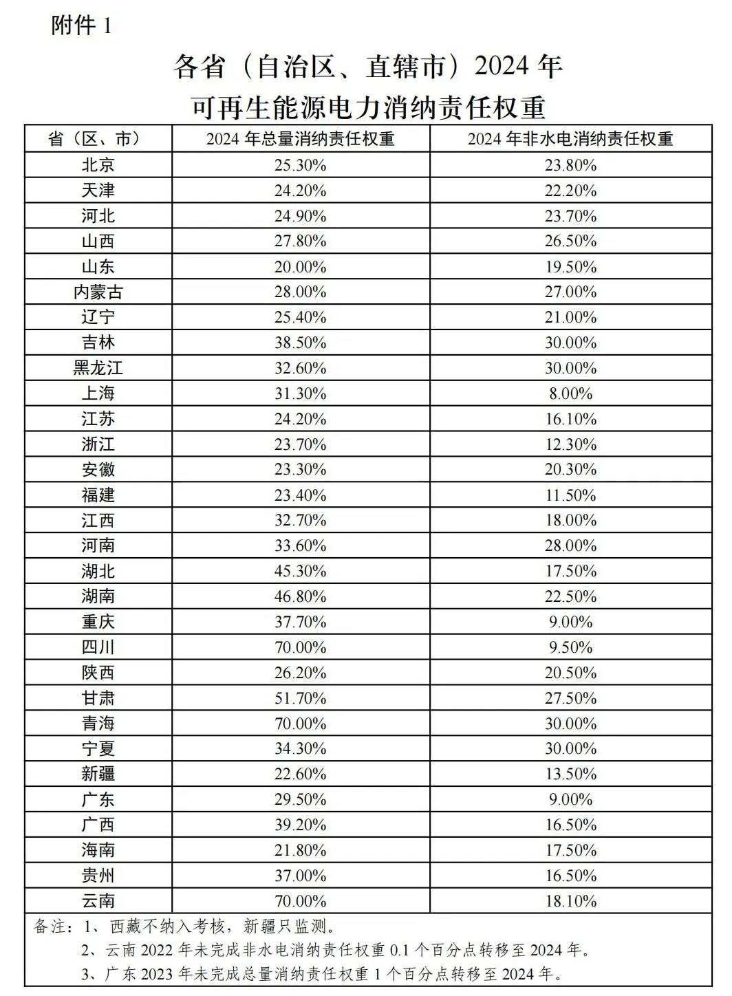7月10日,國(guó)家發(fā)改委辦公廳、國(guó)家能源局綜合司聯(lián)合下發(fā)《關(guān)于2024年可再生能源電力消納責(zé)任權(quán)重及有關(guān)事項(xiàng)的通知》,下發(fā)了2024年、2025年,各省可再生能源電力和非水可再生能源電力消納責(zé)任權(quán)重。