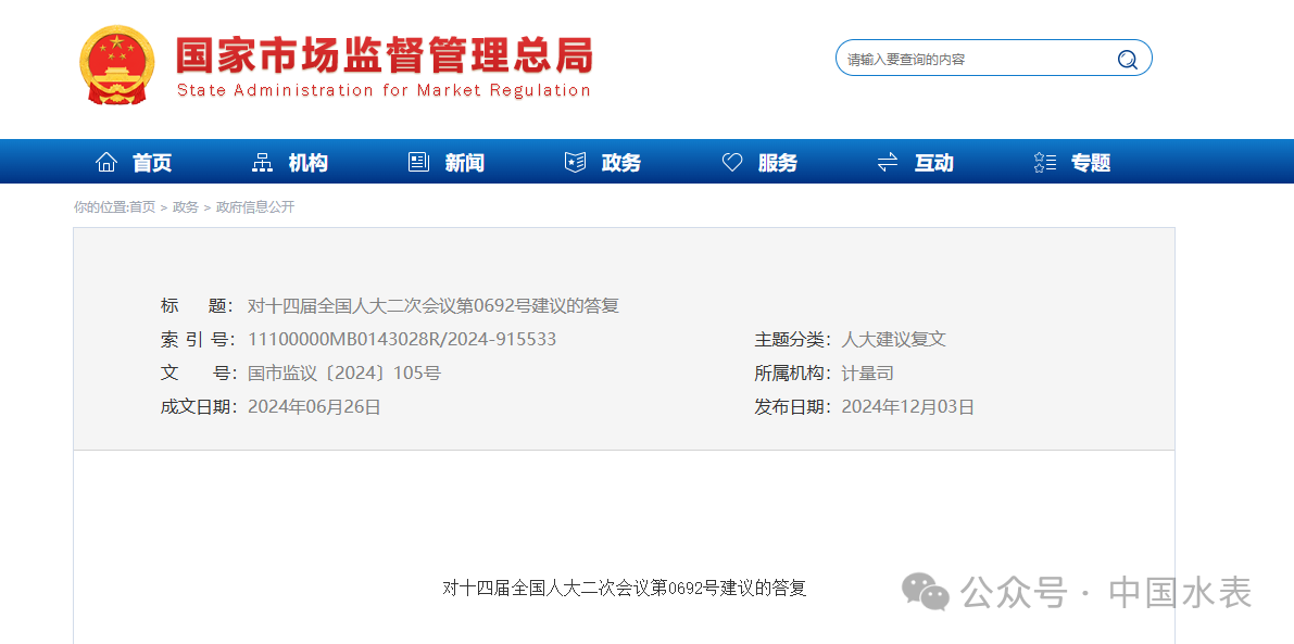 近日,人大代表李豐提出的《關(guān)于優(yōu)化智能水表檢測流程,資源節(jié)約集約利用的建議》獲市場監(jiān)管總局回復(fù)。市場監(jiān)管總局回復(fù)將積極研究探索跨區(qū)域一體化計量器具強制檢定制度改革,推動區(qū)域間強制檢定結(jié)果互認,為“二檢合一”在更大范圍推廣奠定制度基礎(chǔ)。