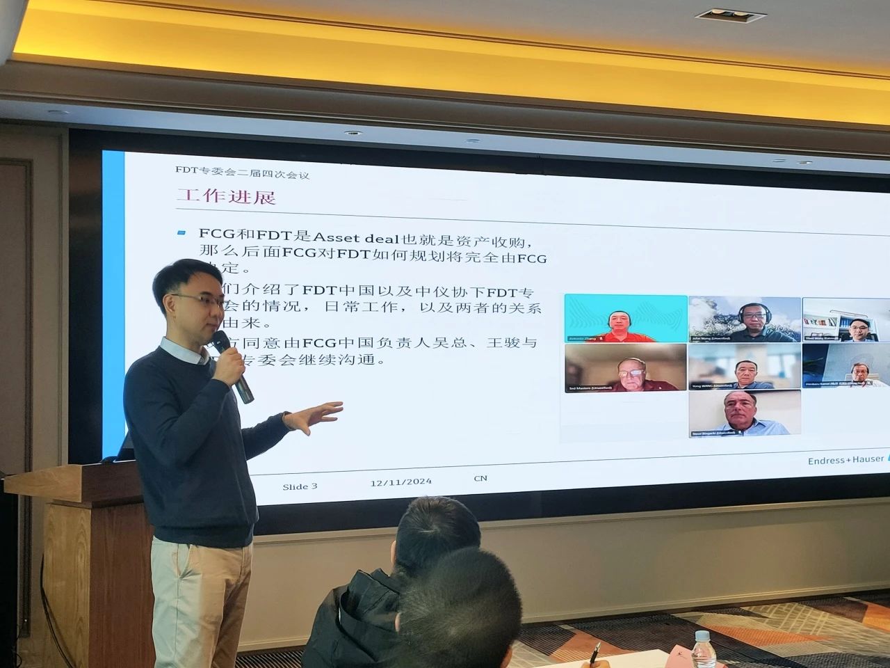 會議于上午9點準時開始,中國FDT專委會常務副主任委員,來自恩德斯豪斯的王奕瑋先生向參加本次會議的全體代表致歡迎詞,向大家介紹了FDT專委會在今年下半年與國際FCG組織的溝通、合作進展,以及對專委會2025年各項重點工作的初步設想。隨后進行了本次會議的一項重要提案表決 -- 專委會委員單位及人員調整方案:增補章安冬為委員單位美名軟件代表;增補FCG為常委單位,王駿為代表。以上提案經現場代表一致通過并立即生效。