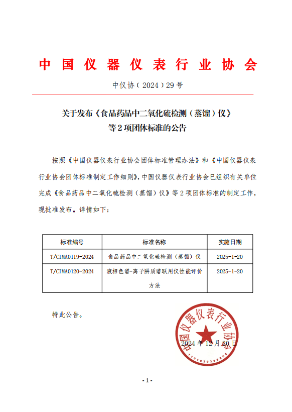 根據《中國儀器儀表行業協會團體標準管理辦法》的規定,中國儀器儀表行業協會(簡稱“協會”)組織完成了由上海赫冠儀器有限公司提出的《食品藥品中二氧化硫檢測(蒸餾)儀》和由常州磐諾儀器有限公司提出的《液相色譜-離子阱質譜聯用儀性能評價方法》2項團體標準的制定工作,現予以發布,特此公告。