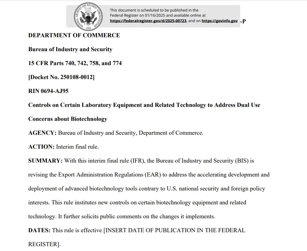 2025年1月15日,美國商務(wù)部工業(yè)與安全局(BIS)發(fā)布一項新的出口管制規(guī)定,對《出口管理條例》(EAR)進行修訂,以應(yīng)對生物技術(shù)領(lǐng)域的“兩用性“問題。該規(guī)則對某些生物技術(shù)設(shè)備及相關(guān)技術(shù)實施了新的管控措施,并就這些變更征求公眾意見。