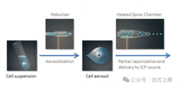 樣品引入:細(xì)胞在被引入質(zhì)譜儀時(shí)被霧化成微小的 droplets(液滴),這個(gè)過程將含有金屬標(biāo)簽抗體或其他細(xì)胞探針標(biāo)記的單細(xì)胞懸液引入等離子體炬中(圖2-1)。