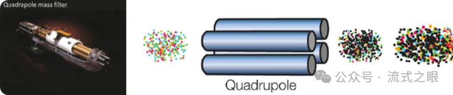 產(chǎn)生的離子云通過真空錐接口進(jìn)入四極離子偏轉(zhuǎn)器,采用四極桿按照離子的質(zhì)荷比(m/z)對離子進(jìn)行過濾并富集,去除常見的生物元素離子,只富集含有目標(biāo)金屬報(bào)告離子(根據(jù)質(zhì)荷比大小)的部分(圖2-4)。這樣可以提高后續(xù)質(zhì)譜分析的準(zhǔn)確性和特異性,只檢測與抗體結(jié)合的重金屬標(biāo)記的蛋白質(zhì)離子。